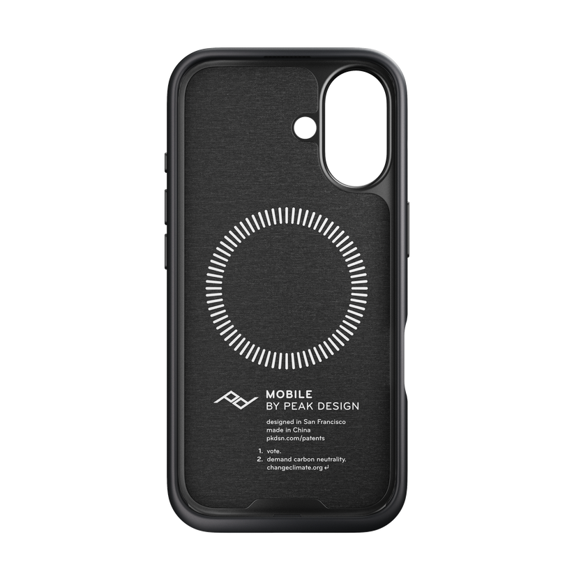 Et Magsafe-kompatibelt iPhone deksel med den perfekte balansen mellom slankhet, smart estetikk og beskyttelse, pluss at den kobles briljant til hele Peak Design Mobile Ecosystem. Dekselet har en slank 2,4 mm tykk profil og beskyttende støtfanger av gummi, alt pakket inn i et vakkert nylon lerretsskall. Men det som virkelig skiller dette dekselet fra andre er det magnetiske/mekaniske låsen som er innebygd rett inn i den. Peak Design kaller denne monteringsteknologien SlimLink™, og den er så rask og sikker at det grenser til magi.