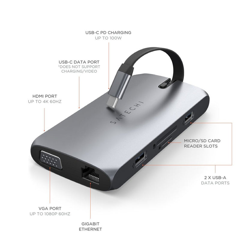 Satechi USB-C On-the-Go Multiport adapter gjør produktiviteten bærbar. Adapteren er designet for bærbarhet og brukervennlighet, og har USB-C PD-lading, HDMI- og VGA-skjermporter, USB-A-dataporter, SD-kortspor og Gigabit Ethernet